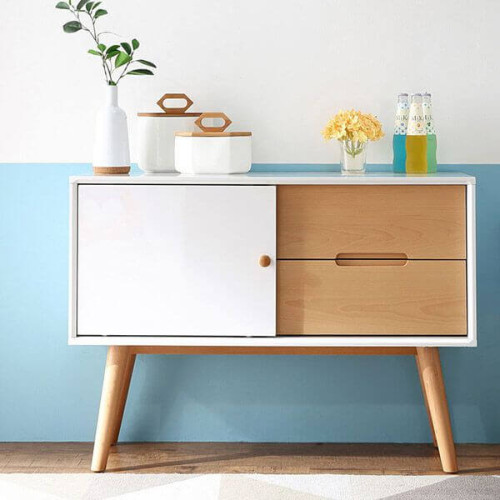 Chất liệu: gỗ công nghiệp MDF phủ Melamine màu kết hợp vân gỗ tự nhiên, chân gỗ tự nhiên